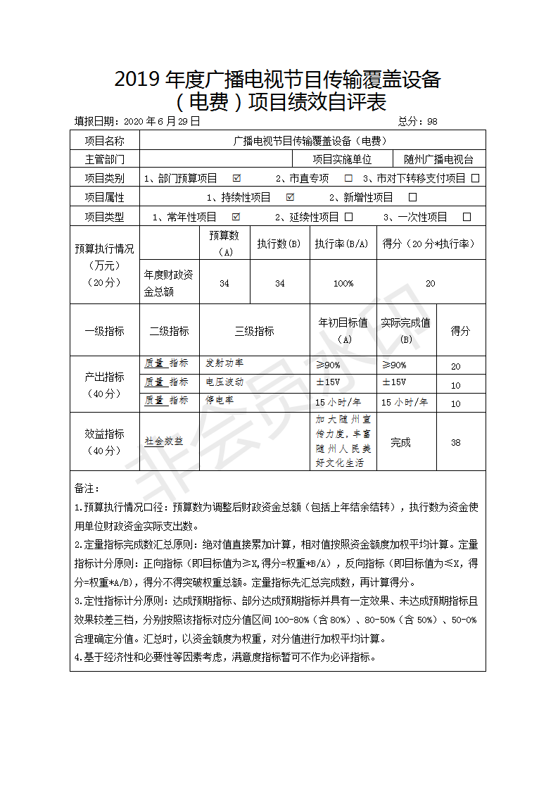 (2)廣播電視播出傳輸及發射電費 34萬元,用于支付每月廣播電視發射設備正常運行電費。我臺制定年度績效目標為發射功率≥90%,電壓波動±15V,全年停電率15小時/年。2019年完成績效目標,有效地保證了優質安全播出。