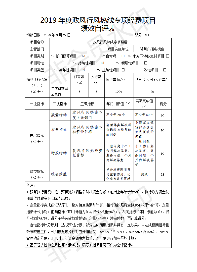 (1)“政風行風熱線”專項經費5萬元,該專項經費為支付“政風行風熱線”欄目設備維護及更新專用采訪器材。“政風行風熱線”年度績效目標定為全年上線部門不少于50個,對通過熱線反應的一般問題十個工作日解決答復,復雜問題一個月內解決答復。年底上線部門及回復問題時效性達到年初目標,群眾滿意度100%。