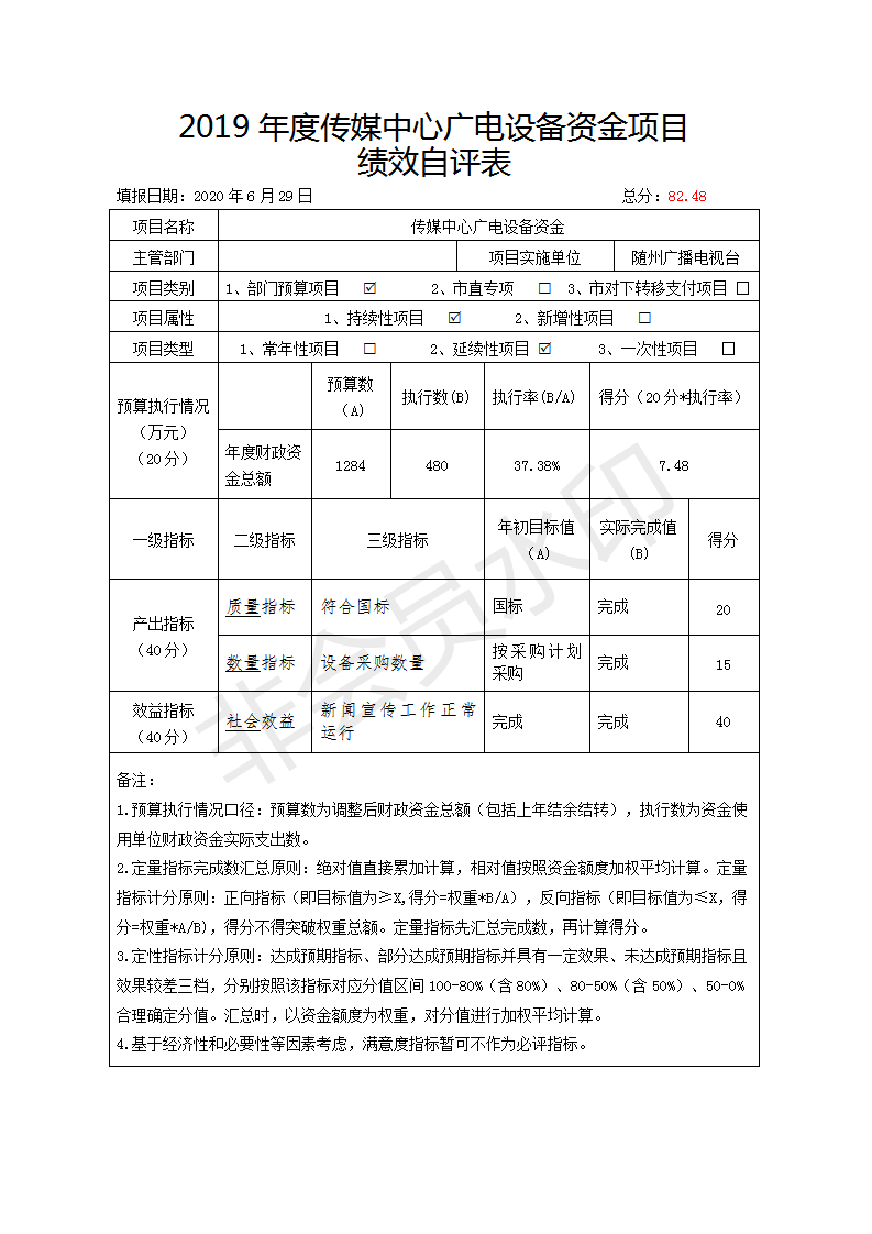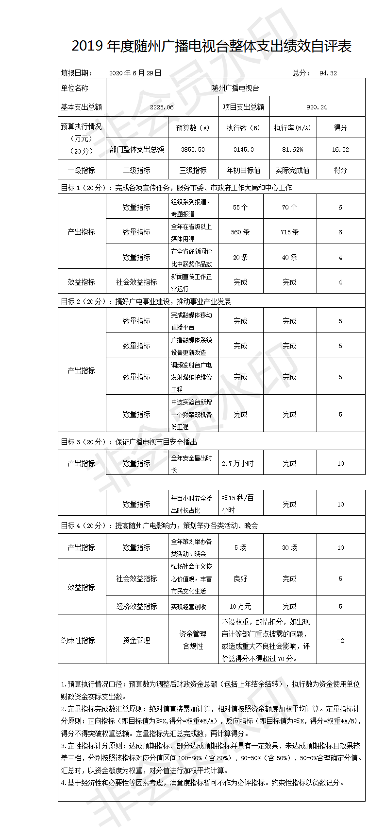 組織開展整體支出績效評價,從評價情況來看,2019年預算資金覆蓋廣電工作的各個需求方面,保證優質安全播出。在預算執行過程中,嚴格按項目分類及資金性質進行管理,有效地利用財政性資金,完成了年初績效目標,按時按質完成市委市政府交辦的各項工作任務。經績效自評,我臺2019年度整體支出績效自評分94.32分。