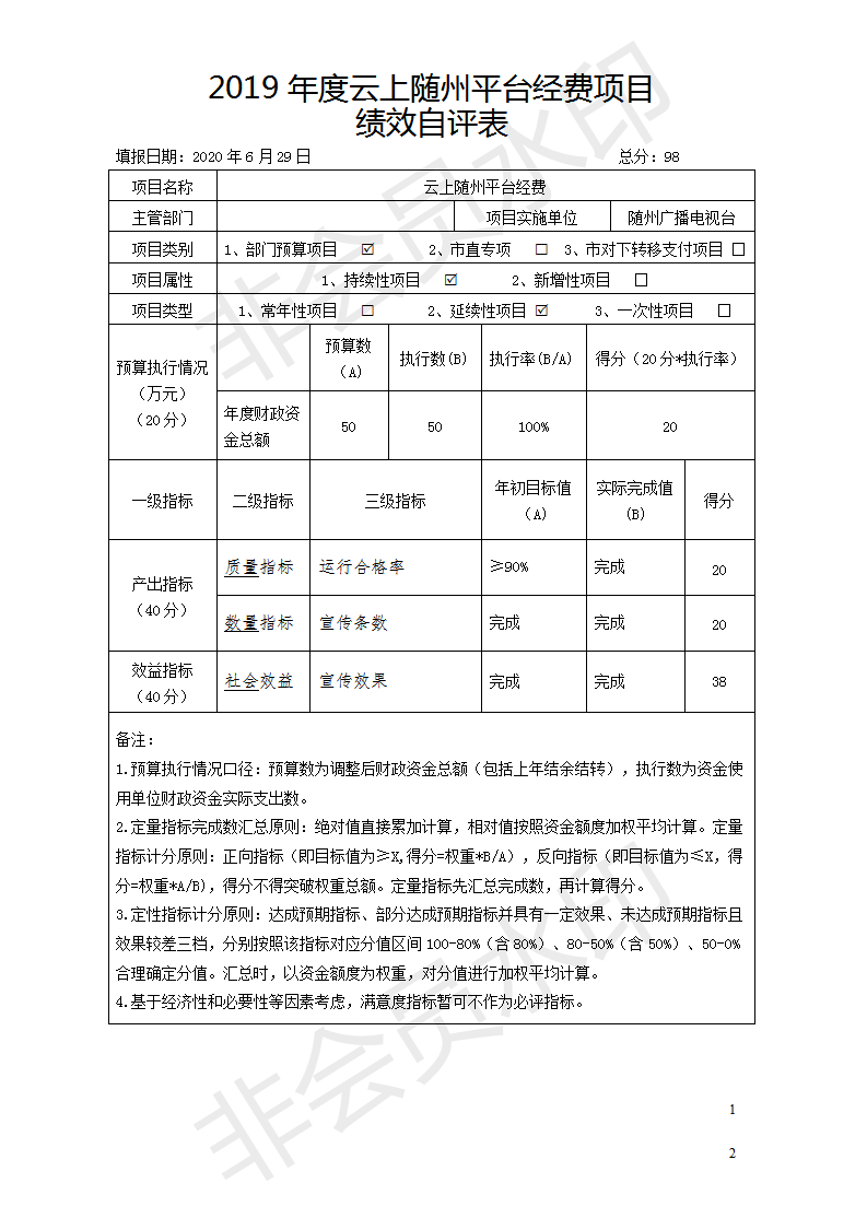 (4)云上隨州平臺經費50萬元,其中上交省帶寬租用費38萬元,維護費用12萬元。年初績效目標為充分發揮平臺的新聞宣傳和政務服務功能及平臺正常安全運行,績效目標任務已完成。