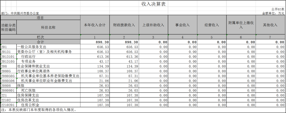 市委辦2019年度預算財政撥款收入預算為519.74萬元萬元,實際收到的一般公共預算財政撥款收入為898.3萬元(追補的為審核撥付的獎勵性工資及機構改革人員變動、調資和離休老干部醫療費撫恤金等);財政部門撥款對賬單898.3?萬元,無差額?。全年財政撥款支出995.67萬元,比上年的總支出683.3萬元增加312.38萬元,主要是機構改革人員變動、調資等原因。