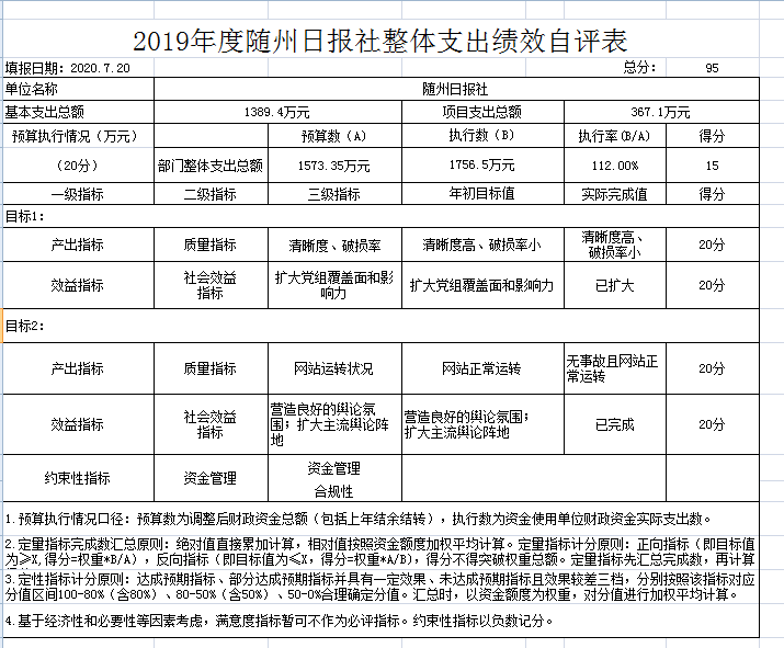 組織開(kāi)展了整體支出績(jī)效評(píng)價(jià),整體得分95分,各項(xiàng)指標(biāo)年初目標(biāo)值與實(shí)際完成值幾乎相同,情況很好。
