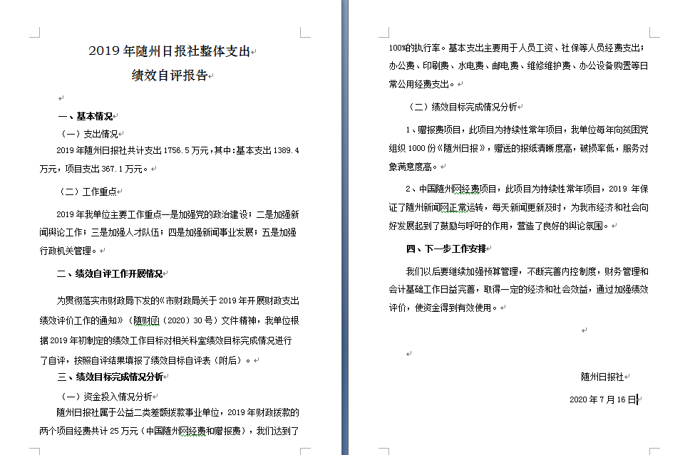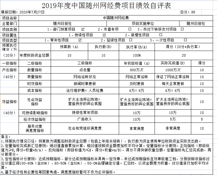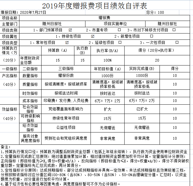 我單位對(duì)兩個(gè)項(xiàng)目進(jìn)行了績(jī)效自評(píng),分別為中國(guó)隨州網(wǎng)經(jīng)費(fèi)和贈(zèng)報(bào)費(fèi)。年初預(yù)算數(shù)分別為10萬(wàn)元和15萬(wàn)元,全年執(zhí)行數(shù)共計(jì)25萬(wàn)元,完成預(yù)算的100%。項(xiàng)目主要效果:一是擴(kuò)大了主流輿論陣地,為我市經(jīng)濟(jì)和發(fā)展?fàn)I造良好的輿論氛圍。二是擴(kuò)大主流媒體影響力和公信力。三是更好的服務(wù)讀者、服務(wù)社會(huì)。
