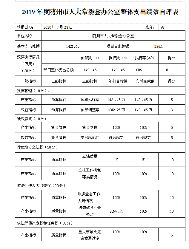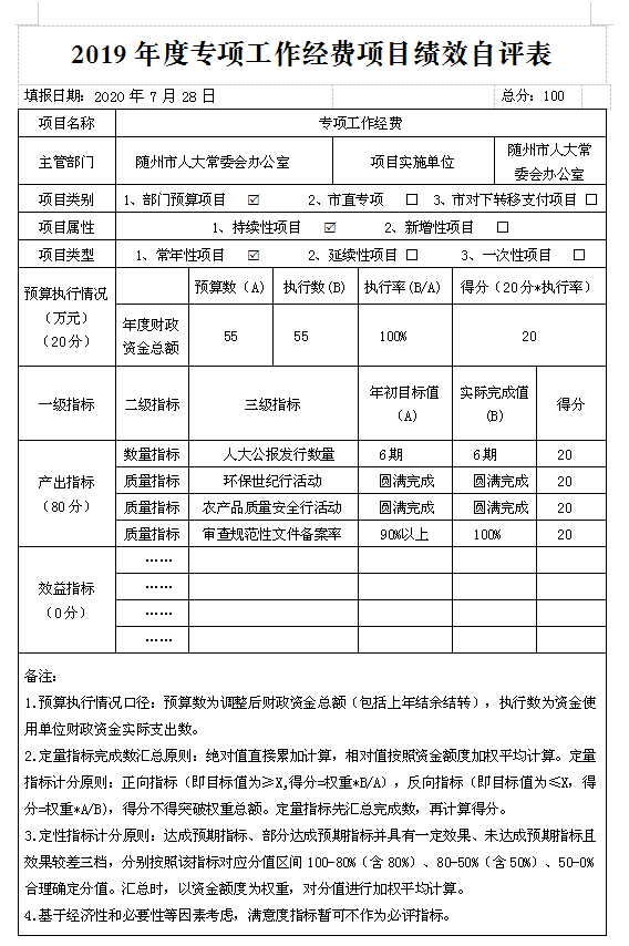 ????1、人大專項工作經費預算55萬,實際支出55萬。主要用于主要用于人大公報經費、離退休經費、工作評議及議案辦理經費、環保世紀行、農產品質量安全荊楚行、規范性文件備案審查、預算審查監督咨詢及績效管理等。該項目執行率達到100%。