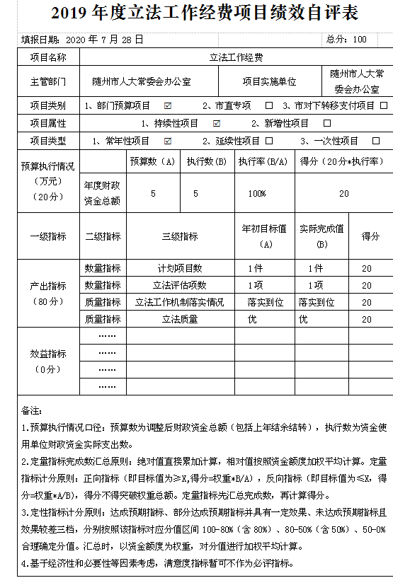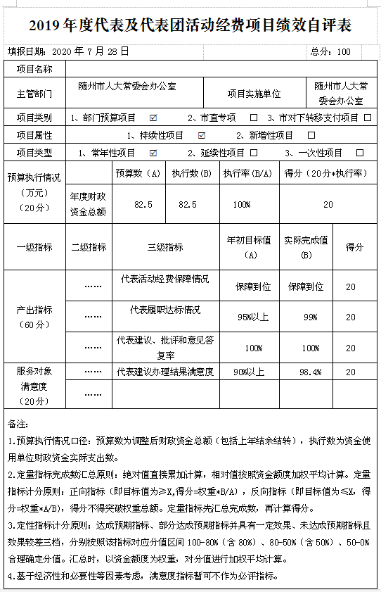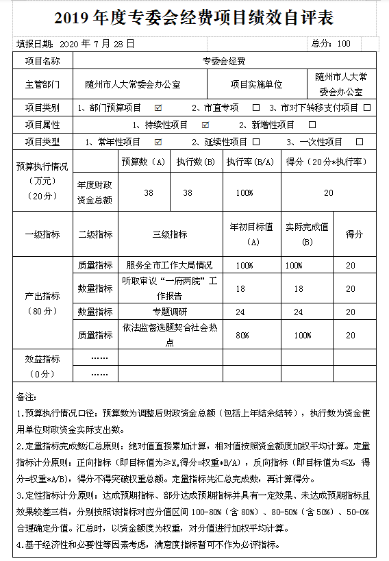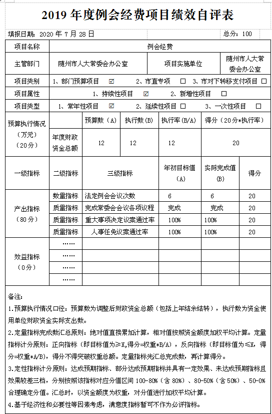 (一)預算績效管理工作開展情況。根據預算績效管理要求,本單位組織對2019年度一般公共預算項目支出全面開展績效自評,共涉及項目6個,資金242.5萬元,占一般公共預算項目支出總額的100%。從評價情況來看,本單位明確了經費審批權限及程序,經費預算管理、財務經費管理、資產購置與處置、財務監督等,針對“三公”經費建立了公用經費標準定額體系,開展公用經費使用監督和績效評估,進一步落實厲行節約的各項規定,確保“三公經費”使用合理合規。自評為98分。