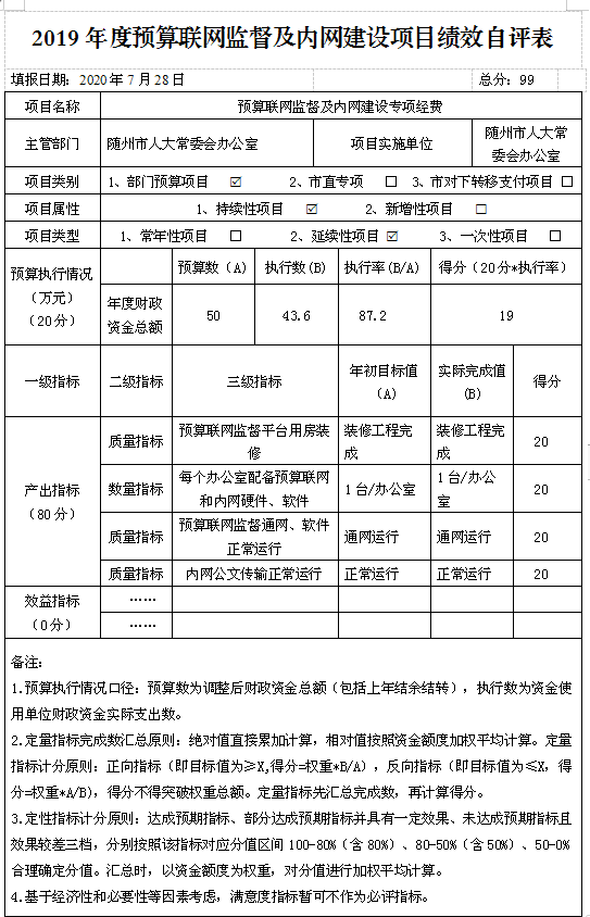 ????6、人大預算聯網監督及內網建設經費100萬,實際預算下達50萬元,實際支出43.6萬元,該項目時間為2年,在2019年執行完成。主要用于人大預算聯網監督會議室建設,預算聯網及內網建設軟件、硬件建設費用支出。該項目執行率達到43.6%。