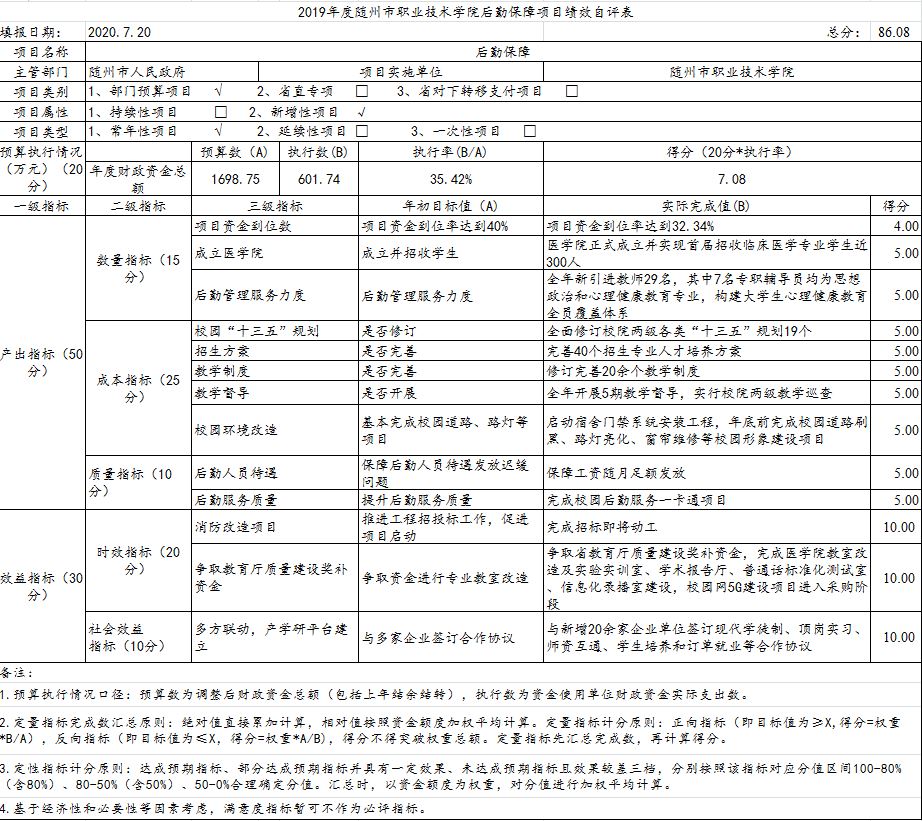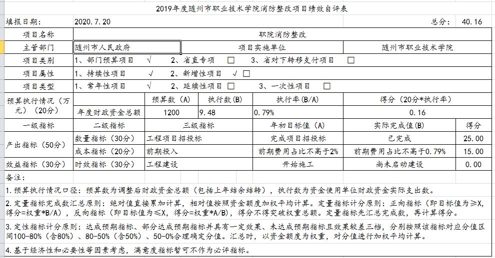 根據預算績效管理要求,我單位組織人員對2019年度一般公共預算項目支出全面開展績效自評,共涉及項目三個,資金3145.77萬元,占一般公共預算項目支出總額的48.48%。經評價,項目支出自評平均得分81.35分,后勤保障、教學保障項目正常開展實施,資金按規定用途使用,消防整改工程因工程項目的招投標手續于2019年確認中標單位,工程尚未啟動,僅支付前期籌備費用9.48萬元,直接影響該項目的資金執行率和項目總執行率。