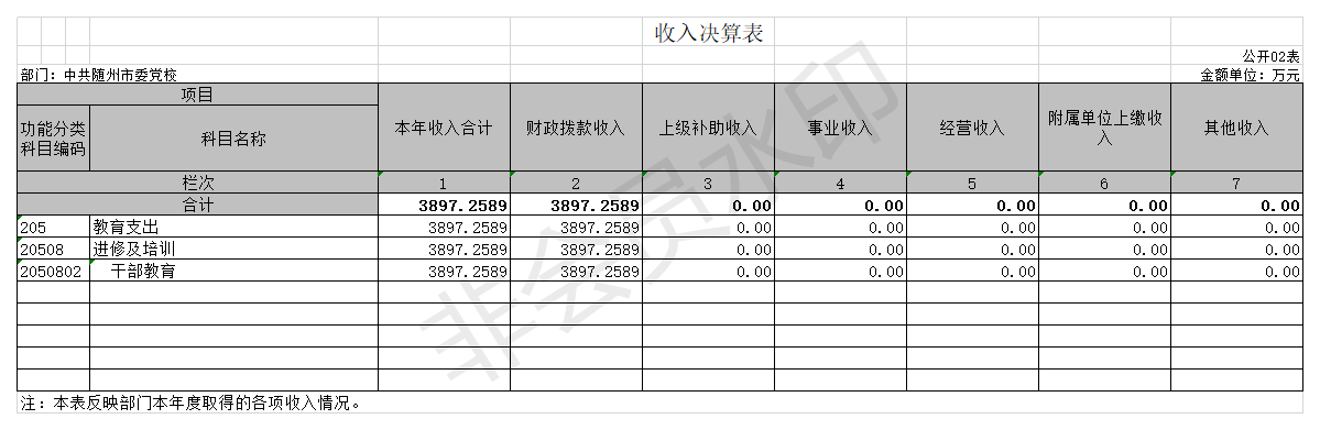 市委黨校2019年決算總收入3897.26萬元,比上年度增加997.67萬元,增加了34.41%,主要是項目經費增加了,“新校區設備購置費”增多,新增“新校園后勤服務外包費”。決算總收入全部都是一般公共預算財政撥款收入。