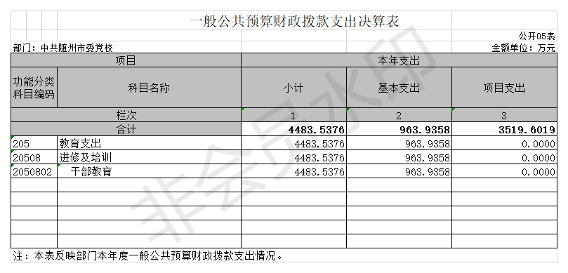 2019年度一般公共財政撥款支出4483.54萬元,其中人員經費支出為807.37萬元,占18%,公用經費支出為156.56萬元,占3.5%,項目經費支出為3519.6萬元,占78.5% 。財政撥款決算支出比年初支出預算的3897.26萬元多586.28萬元,主要原因是市委黨校新校園設備購置到位率高,向財政申請增加了“新校區教學設備購置”費。