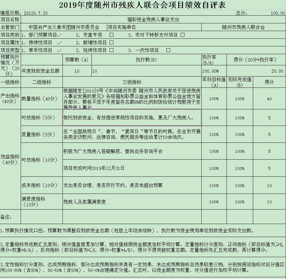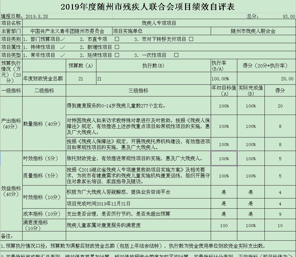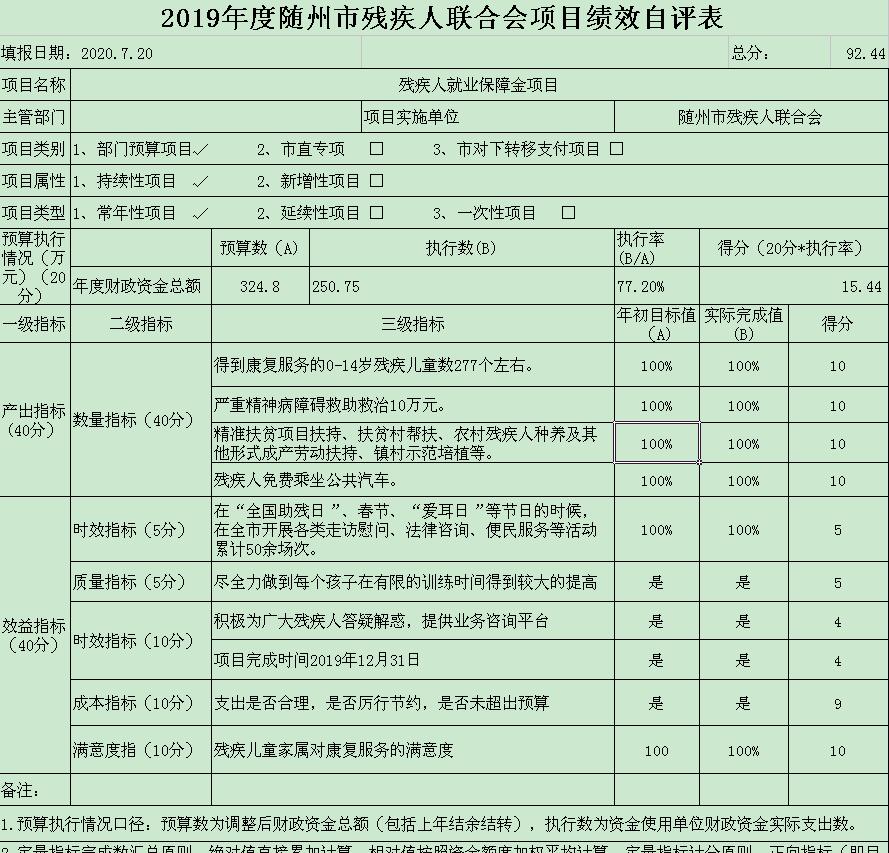 根據(jù)預(yù)算績效管理要求,2019年我單位預(yù)算項目3個,項目名稱分別為:殘疾人就業(yè)保障金支出項目、殘疾人事業(yè)支出項目(財政撥款補助)、福彩項目。2019年項目預(yù)算數(shù)共計906萬元,收入完成數(shù)497.26共計萬元(其中撥付市殘聯(lián)機關(guān)236萬元,市殘疾人就業(yè)服務(wù)中心80萬元,市殘聯(lián)康復(fù)中心91.26萬元,高新區(qū)殘聯(lián)30萬元,嚴重精神病障礙救助救治10萬元,殘疾人免費乘車補助50萬元)。