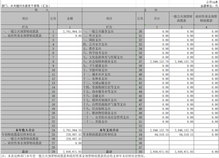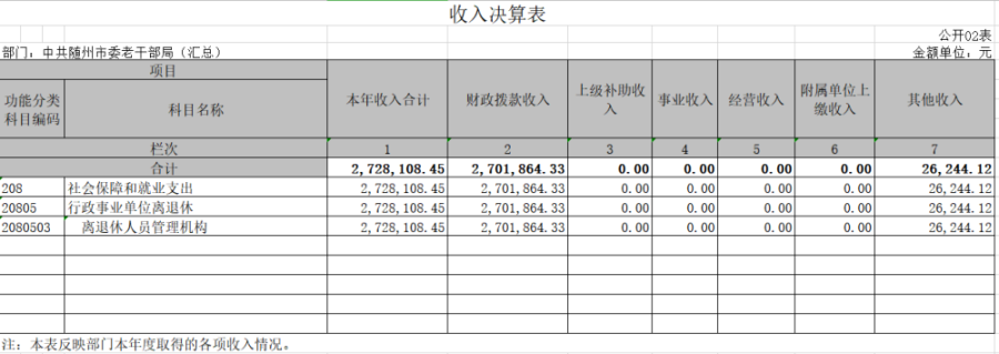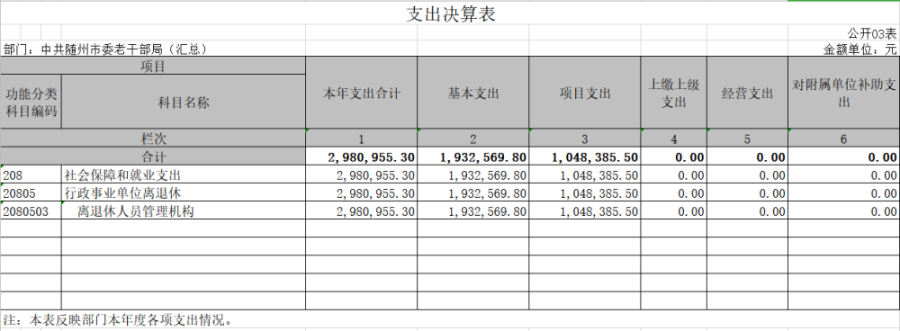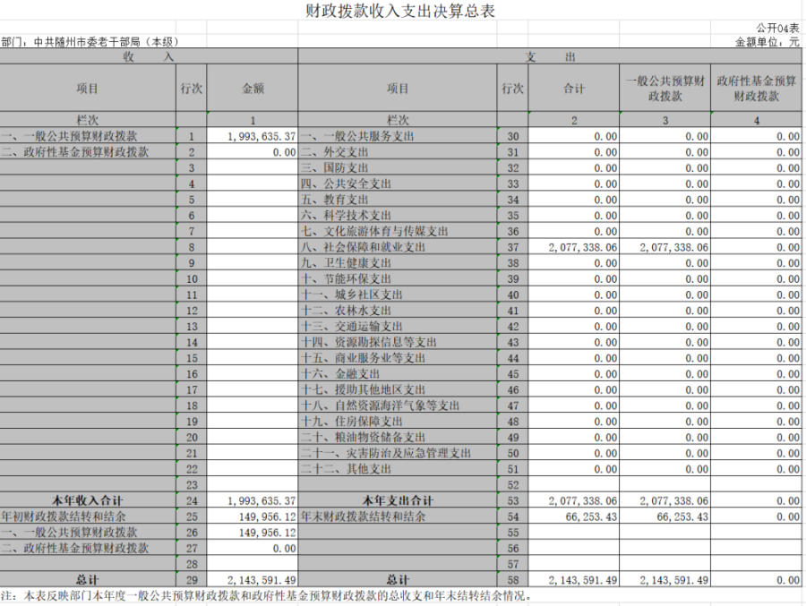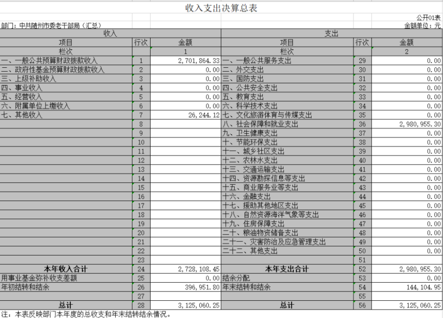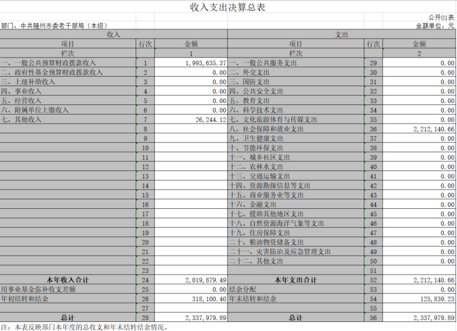 ????1、市委老干部局(含隨州市企事業(yè)單位離休干部管理服務(wù)中心)2019年決算總收入312.51萬元,其中: 財(cái)政撥款收入270.19萬元,占86.46%;其他收入2.62萬元,占0.84%;年初結(jié)轉(zhuǎn)和結(jié)余39.7萬元,占12.7%。與上年決算293.37萬元收入相比增加19.14萬元,增幅6.52%,增加主要原因是今年機(jī)構(gòu)改革,轉(zhuǎn)入5人,導(dǎo)致人員工資等收入增加。支出總計(jì)312.51萬元,其中實(shí)際支出298.1萬元,占95.39%;年末結(jié)轉(zhuǎn)結(jié)余支出14.41萬元,占4.61%。實(shí)際支出與上年249.36萬元相比增加48.74萬元,增長19.55%,減少的主要原因是今年機(jī)構(gòu)改革,轉(zhuǎn)入5人,導(dǎo)致人員工資等支出增加。