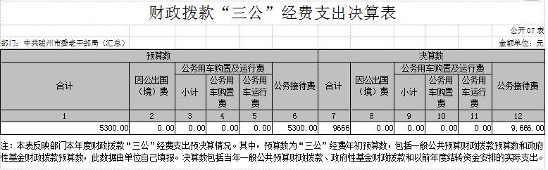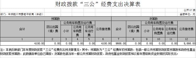 ????1、市委老干部局(含隨州市企事業(yè)單位離休干部管理服務(wù)中心)2019年“三公”經(jīng)費(fèi)支出0.97萬元,比年初預(yù)算數(shù)1萬元減少0.03萬元,下降3%,減少原因主要是堅(jiān)決執(zhí)行中央八項(xiàng)規(guī)定精神,嚴(yán)格控制“三公”經(jīng)費(fèi)。與上年決算數(shù)0.44萬元相比增加0.53萬元,增長120.45%。其中:因公出國(境)費(fèi)年初未安排預(yù)算,2019年沒有產(chǎn)生支出,比上年度支出決算相比沒有變化;公務(wù)接待費(fèi)年初預(yù)算安排1萬元,2019年共接待13批次70人,實(shí)際支出0.97萬元,比上年度決算0.44萬元增加0.53萬元,增長120.45%;因?yàn)楣嚫母铮形细刹烤植辉俦A艄珓?wù)用車,因此不再安排公務(wù)用車運(yùn)行維護(hù)費(fèi)預(yù)算,無此項(xiàng)支出,與上年持平;公務(wù)用車購置費(fèi)年初無預(yù)算安排,沒有產(chǎn)生實(shí)際支出。“三公”經(jīng)費(fèi)增加的主要原因是老干部專項(xiàng)經(jīng)費(fèi)公務(wù)接待較多。