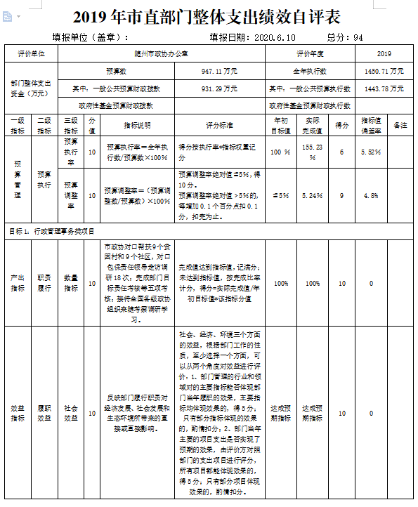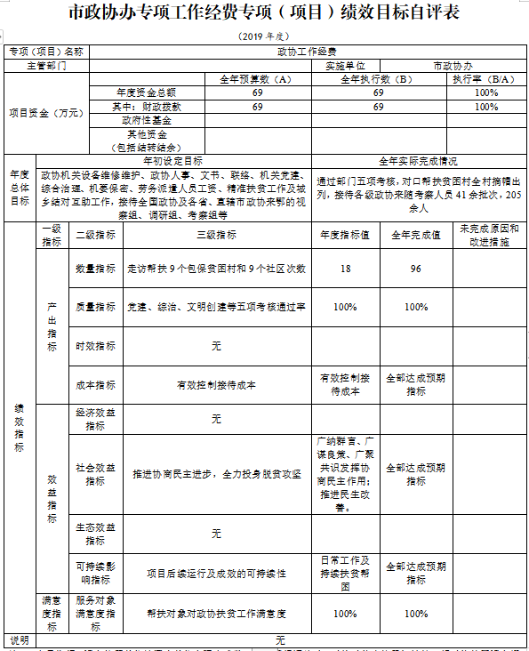 政協工作經費項目績效自評綜述:項目全年預算數為69萬元,執行數為69萬元,完成預算的100%。主要產出和效果:根據隨辦發電〔2017〕4號、隨辦發電〔2017〕5號、隨辦發電〔2017〕27號文件要求,市政協對口幫扶9個貧困村和9個社區,對口包保責任領導走訪調研45次,撥款35萬元;高質量完成部門責任目標考核、機關黨建考核、精神文明建設考核、檔案達標、社會綜合治理考核等五項考核;接待全國各級政協組織來隨考察調研學習達41余批次,共205余人,并嚴格執行中央八項規定,有效控制接待費支出。