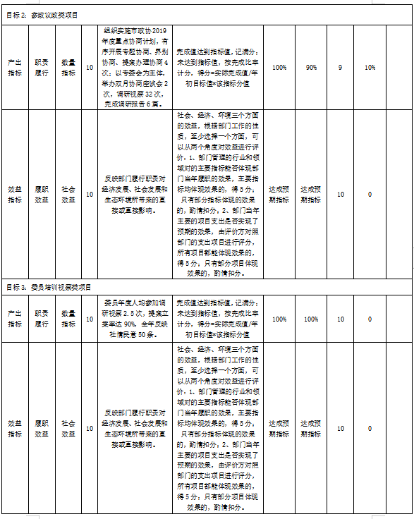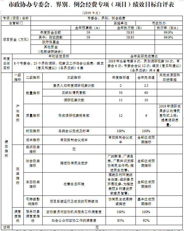 專委會、例會、界別經費項目績效自評綜述:項目全年預算數為59萬元,執行數為58.95萬元,完成預算的99.9%。主要產出和效果:7個專委會各召開2次專委會會議,到會率達到90%,開展各類調研視察活動30次,形成調研視察報告共6篇,嚴格執行中央八項規定,有效控制支出成本;召開常委會會議4次,編發《意見和建議》《各界反映》6篇,有效控制會議成本。