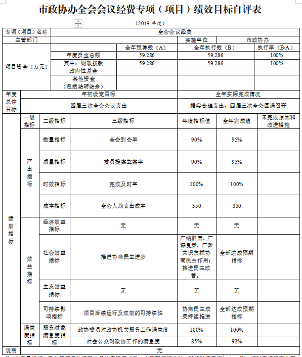 ??全會會議經費項目績效自評綜述:項目全年預算數為59.286萬元,執行數為59.286萬元,完成預算的100%。主要產出和效果:根據市政協常委會2019年工作計劃,于1月21日至23日,在隨州賓館召開隨州市政協四屆次全會,到會率達95%,本次會議收到提案175件,立案162件,立案率達93%,會議支出嚴格按照《隨州市會議費管理辦法》,人均會議支出控制在350元以內。