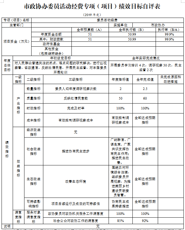 委員活動經費項目績效自評綜述:項目全年預算數為51萬元,執行數為50.99萬元,完成預算的99.9%。主要產出和效果:四屆政協按照界別和專業相似性,劃分了19個委員活動小組,根據市委市政府重點工作和市政協常委會2019年工作要點,各委員活動小組自行組織開展視察調研活動,人均年度參加調研視察活動2.5次,向中央、省級反映社情民意達50余條,舉辦一期50人的政協委員培訓班,經費支出嚴格按照中央八項規定,有效控制人均支出成本。