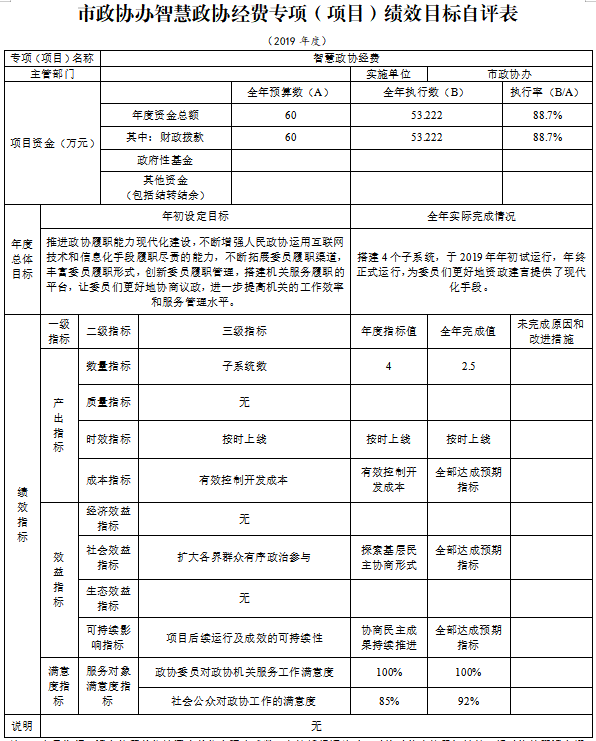 智慧政協經費項目績效自評綜述:項目全年預算數為60萬元,執行數為53.22萬元,完成預算的88.7%。主要產出和效果:開發一個政協委員線上履職管理平臺,內含會議管理、活動管理、提案辦理、委員考核4個子系統,以及手機APP,并于2019年上線運行,目前運行良好。