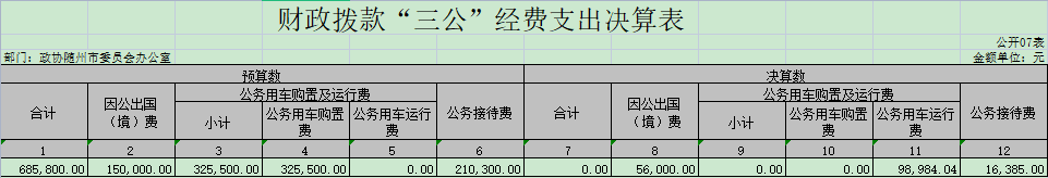 12、“三公”經費:納入財政預決算管理的“三公”經費,是指各部門用財政撥款安排的因公出國(境)費、公務用車購置及運行費和公務接待費。其中,因公出國(境)費反映單位公務出國(境)的國際旅費、國外城市間交通費、住宿費、伙食費、培訓費、公雜費等支出;公務用車購置及運行費反映單位公務用車車輛購置支出(含車輛購置稅)及租用費、燃料費、維修費、過路過橋費、保險費、安全獎勵費用等支出;公務接待費反映單位按規定開支的各類公務接待(含外賓接待)支出。
