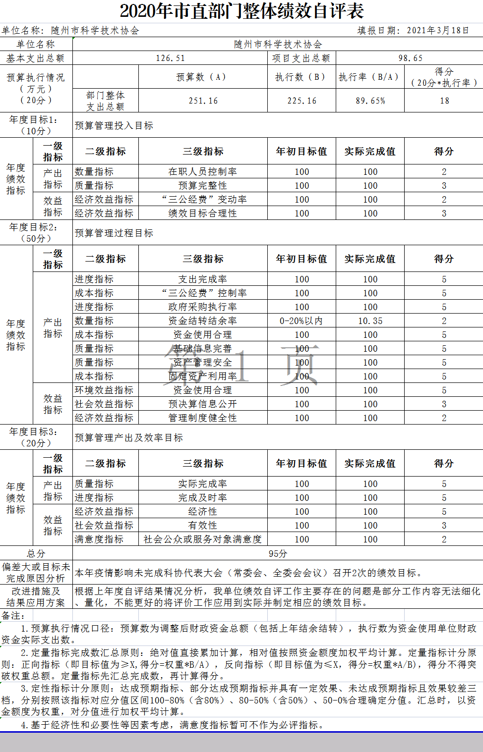 部門項目績效自評綜述:項目全年預算數為57.70萬元,執行數為48.15萬元,完成預算55.38%。主要產出和效益:一是科學技術普及實施率達95%,;二是維護科技工作者群體和諧穩定。發現的問題及原因:一是項目預算的準確性不高,二是部門支出財務管理不規范;下一步改進措施:一是要求強化項目管理,二是強化預算執行,三是嚴格執行中央八項規定和省委省政府十項規定精神。