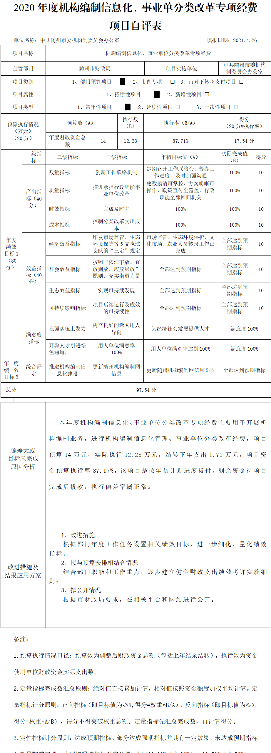 附2、隨州市機構編制委員會辦公室2020年度機構編制信息化、事業單位分類改革專項經費項目自評表