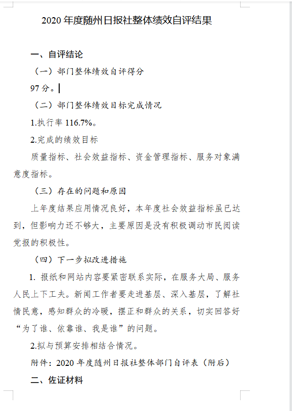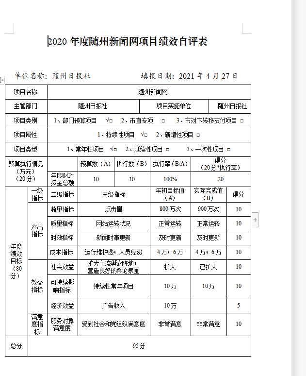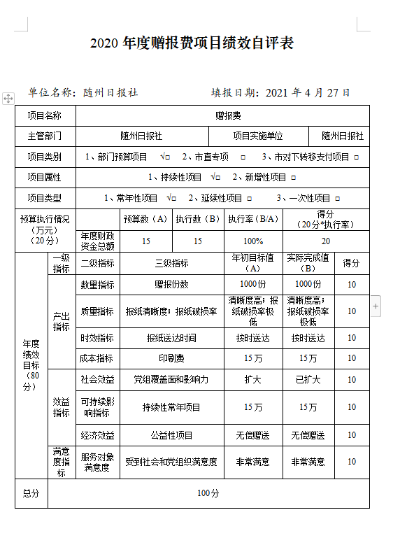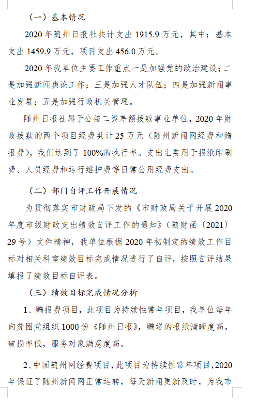 我單位對兩個項目進(jìn)行了績效自評,分別為中國隨州網(wǎng)經(jīng)費(fèi)和贈報費(fèi)。年初預(yù)算數(shù)分別為10萬元和15萬元,全年執(zhí)行數(shù)共計25萬元,完成預(yù)算的100%,今后我們將繼續(xù)加強(qiáng)預(yù)算管理,不斷完善內(nèi)控制度,通過加強(qiáng)績效評價,使項目資金得到有效使用。
