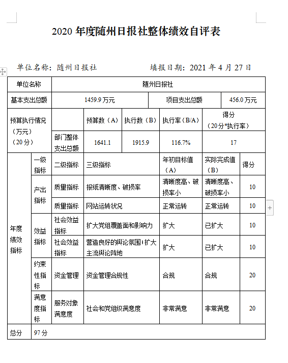 組織開展了整體支出績效評價,整體得分97分,各項指標(biāo)年初目標(biāo)值與實際完成值幾乎相同。