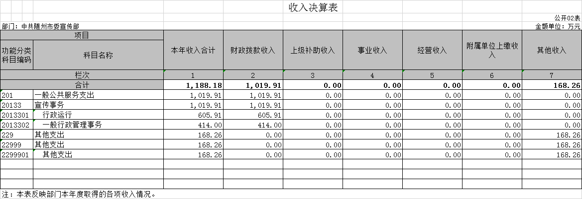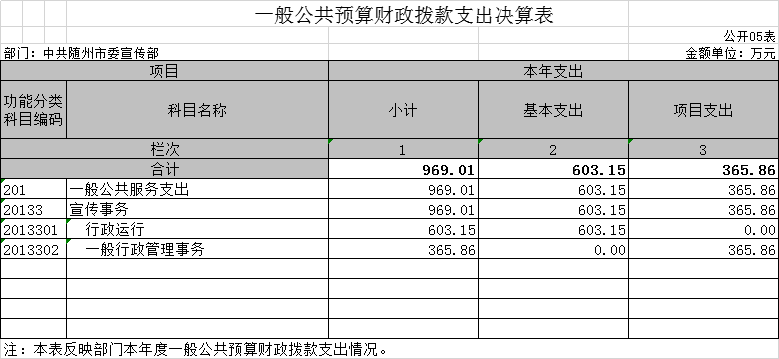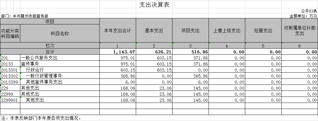 第二部分??中共隨州市委宣傳部2020年度部門決算情況說明一、收入、支出決算情況說明本部門2020年度收入總計1195.2萬元,其中財政撥款收入1019.91萬元、其他收入168.26萬元、上年結轉和結余7.02萬元,收入合計較上年944.05萬元增加26.6%,主要原因是增加了項目預算新時代文明實踐中心建設經費100萬元、市委網信辦應急指揮中心硬軟件建設65萬以及其他預算項目資金增加。???????????? 。本部門2020年度支出總計1143.07萬元,較上年930.5元增加22.84%,主要原因是增加了項目預算新時代文明實踐中心建設經費100萬元、市委網信辦應急指揮中心硬軟件建設65萬以及其他預算項目資金增加。????????????。本部門2020年度預算支出合計1195.2萬元,實際支出1143.07萬元。其中基本支出626.21萬元,項目支出516.86萬元。在基本支出中,工資福利支出為559.37萬元,占48.93%;商品和服務支出為66.84萬元,占5.85%,主要為日常辦公費用等支出。項目支出中516.86萬元,占比45.22%。二、 “三公”經費支出說明本部門2020年度一般公共預算財政撥款“三公”經費支出年初預算數為11.02萬元,決算數為5.83萬元,完成預算的52.9%,決算數較上年的6.86萬元減少15.01%,主要原因是疫情期間“三公”經費減少。其中:(一)2020年度本部門無因公出國(境)情況。因公出國(境)支出年初預算數為0萬元,決算數為0萬元。(二)2020年度本部門國內公務接待費支出年初預算數為7.47萬元,決算數為2.41萬元,全年接待32批次312人次,決算數較上年3.46萬元減少30.3%,主要原因是本年受疫情影響,公務接待次數、人員減少。(三)2020年度本部門公務用車保有量1臺,未新購置公務用車。公務用車購置年初預算數0臺,其中公務用車購置年初預算數為0萬元,決算數為0萬元。公務用車運行維護費年初預算數為3.55萬元,決算數為3.42萬元,決算數較上年增加0.53%。主要原因是:情期間公務車輛承擔督導檢查、應急調度比較頻繁。