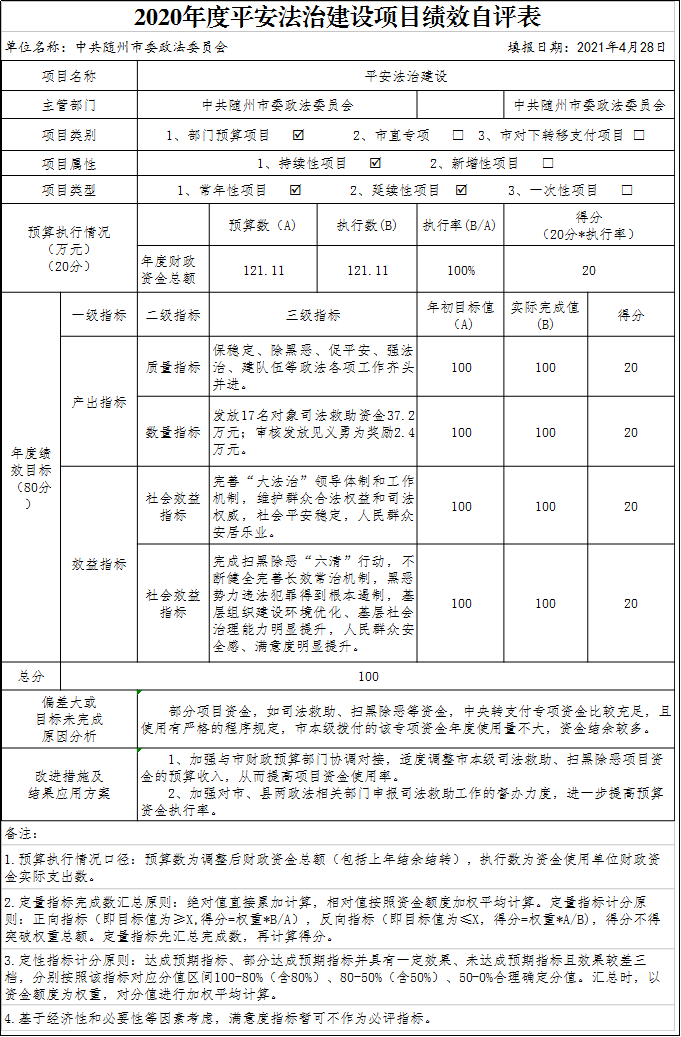附件:2020年度平安法治建設項目績效自評表