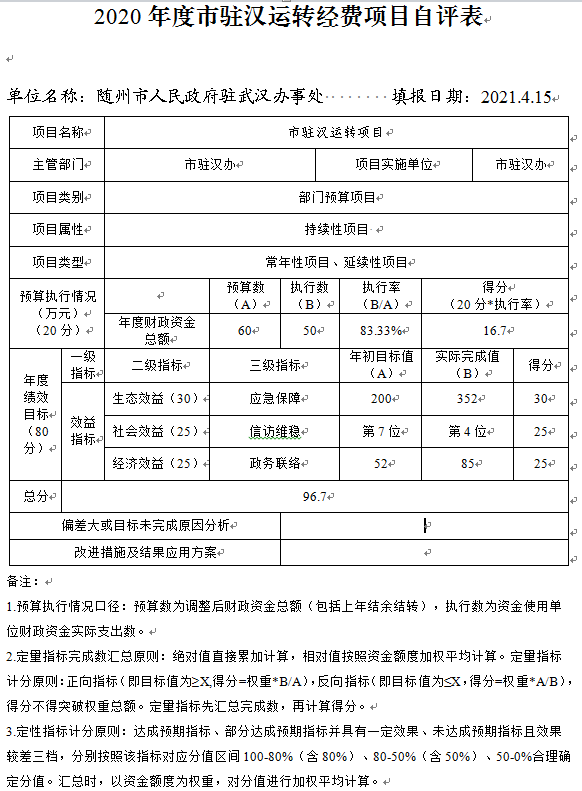 附:《2020年度市駐漢辦整體績效評價自評表》