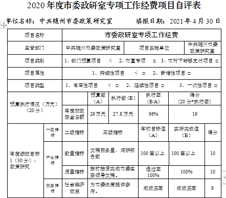 根據預算績效管理要求,本部門組織對2020年度一般公共預算項目支出全面績效自評,共涉及項目1個,資金27.8萬元,占一般公共預算項目支出總額100%。從評價情況來看,2020年度“政府政研專項工作經費”項目績效自評得分:97分,結果為“良”。
