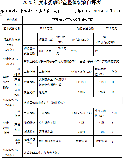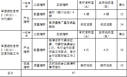 主要產出和效益:一是文稿服務量、調研報告數100多篇;二是編印《隨州論壇》4期;三是提請召開市委深改委、市委財經委會議2次,制訂全市改革財經工作要點,督辦全市改革財經工作2次。