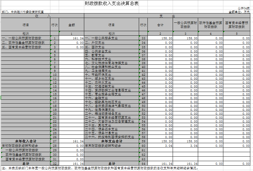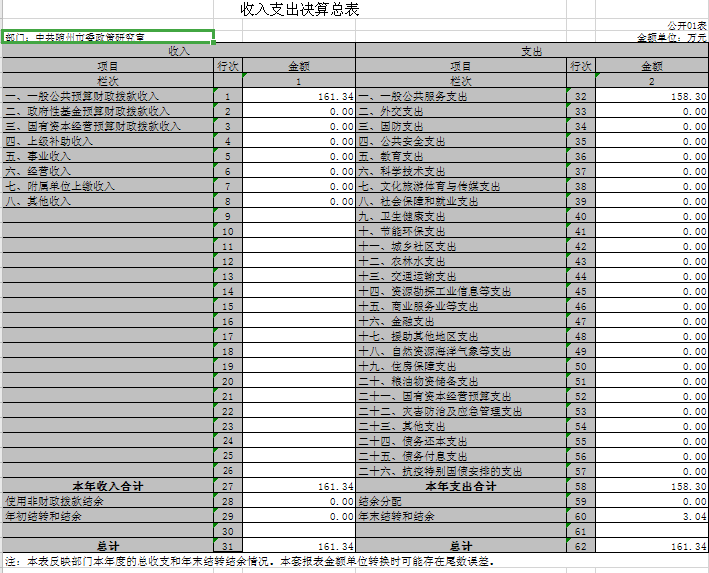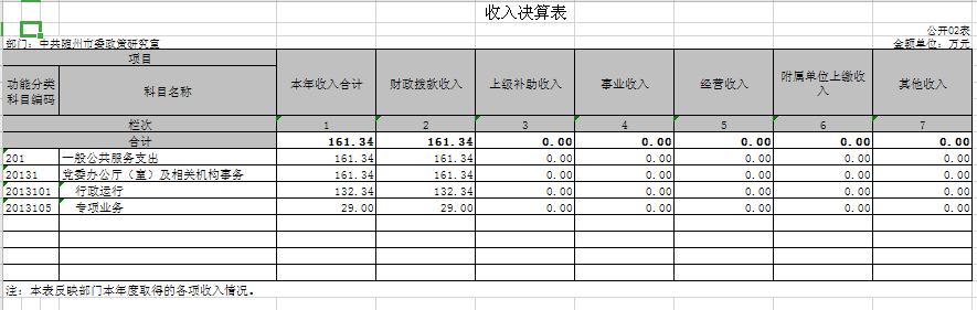 本年收入總計161.34萬元,其中財政撥款(補助)收入161.34萬元,其他收入0萬元,上年結轉0萬元。