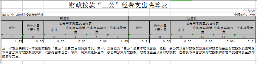 2020年度一般公共預算安排的“三公”經費支出決算數0.21萬元,其中,因公出國出境費0萬元、公務接待費0.21萬元、公務用車購置及運行費0萬元。