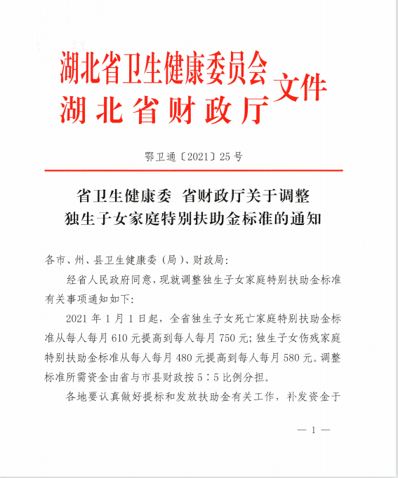 省衛(wèi)生健康委 省財政廳關(guān)于調(diào)整獨(dú)生子女家庭特別扶助金標(biāo)準(zhǔn)的通知