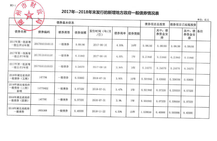 2017年-2018年末發行的新增地方政府一般債券情況表