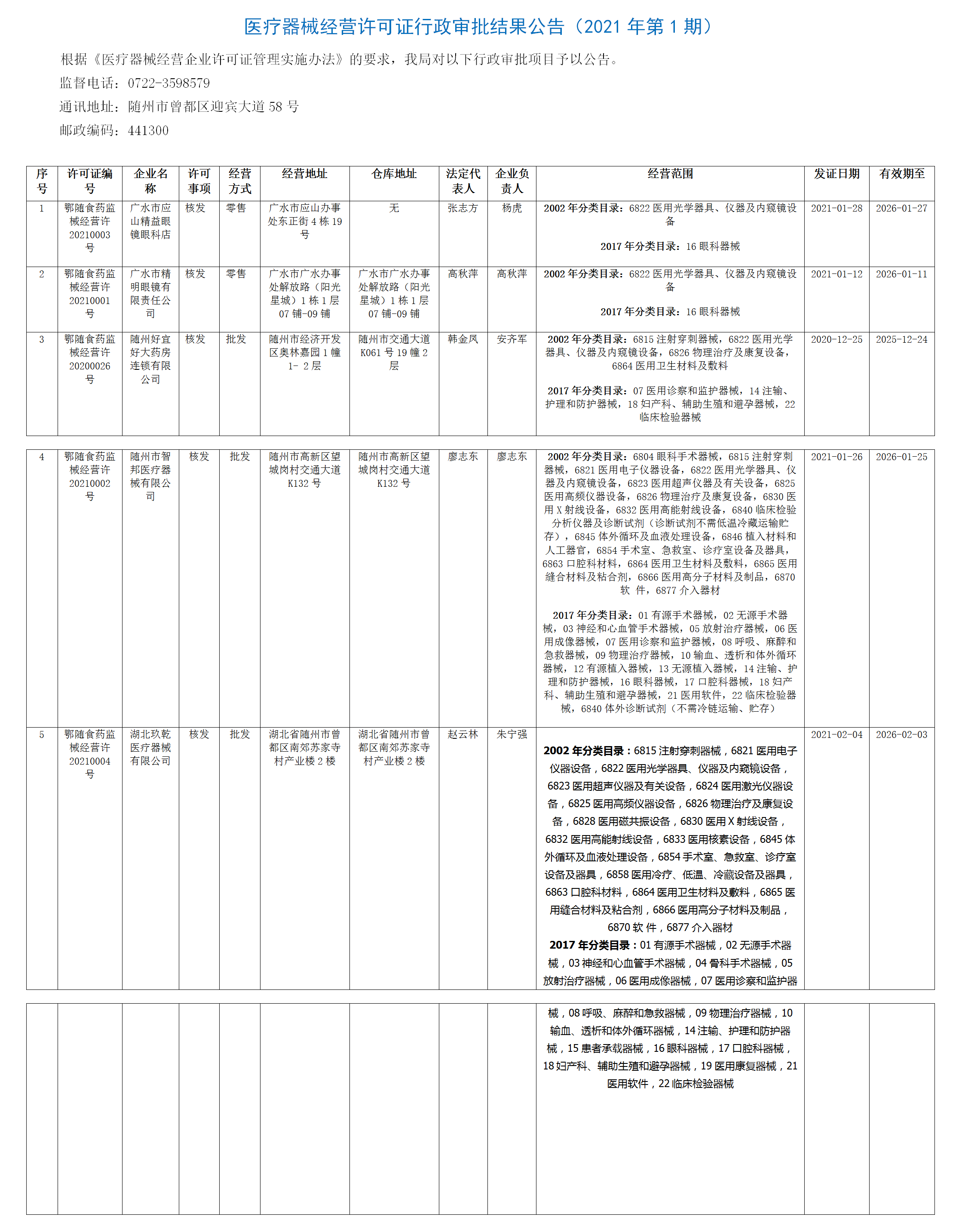 醫療器械經營許可證行政審批結果公告(2021年第1期)
