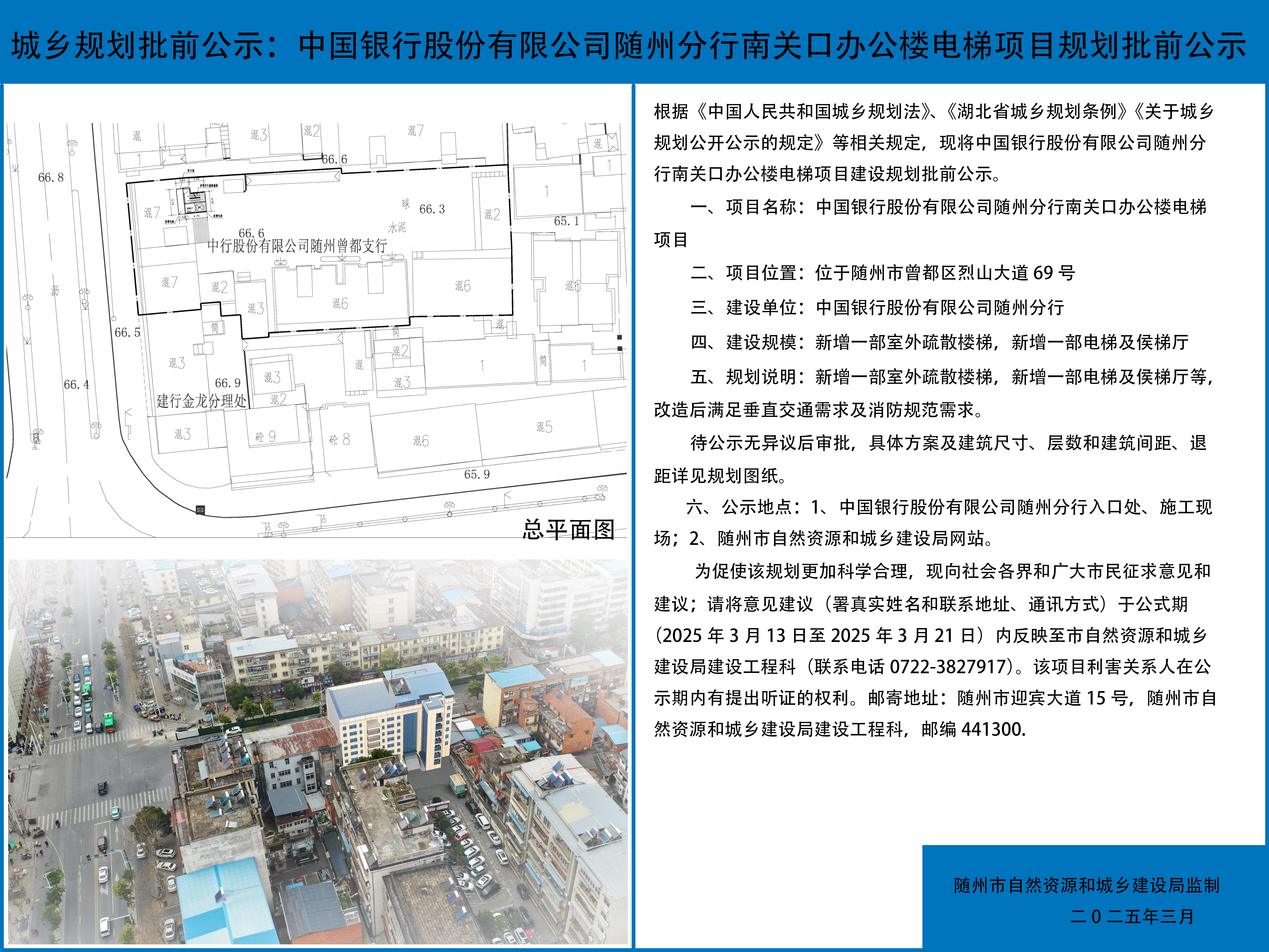 城鄉規劃批前公示:中國銀行股份有限公司隨州分行南關口辦公樓電梯項目規劃批前公示
