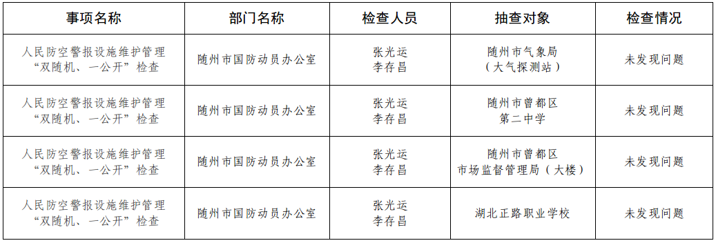隨州市國防動員辦公室2025年人防警報設施維護管理“雙隨機、一公開”檢查情況公示