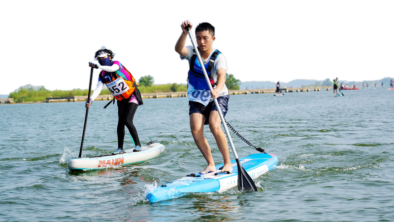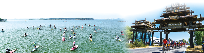 槳板賽“槳?jiǎng)硬ü饫?、人在水上行?br/>自行車聯(lián)賽選手騎行銀杏谷度假區(qū)