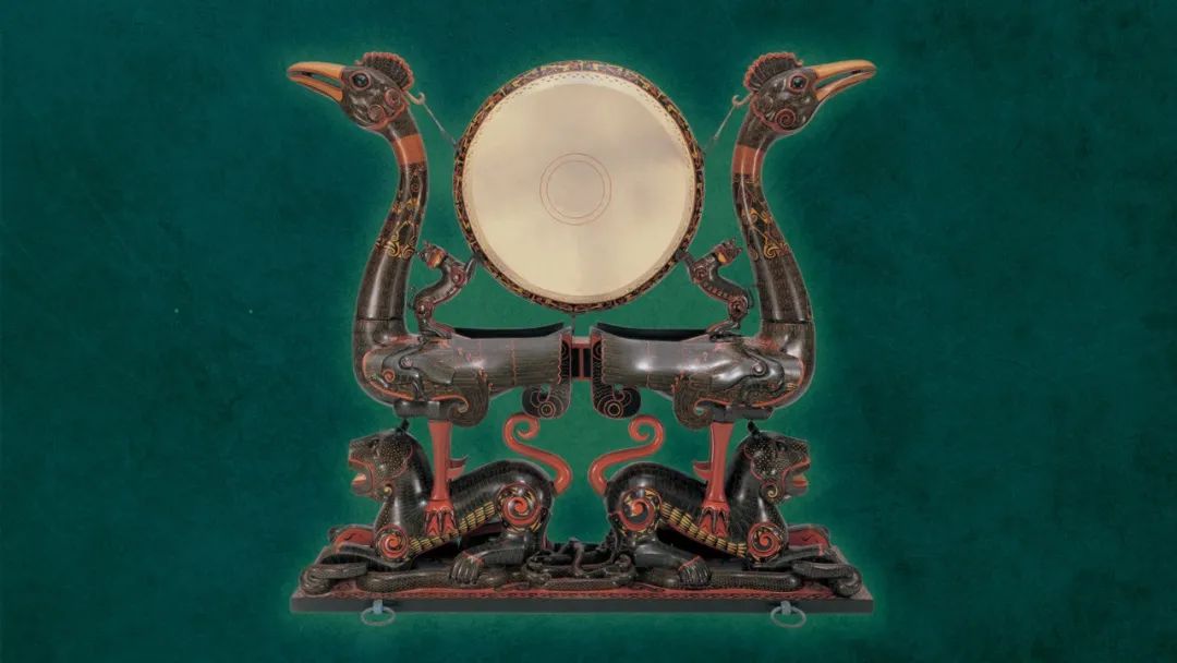 金石絲竹之聲在當時祭祀宴飲和日常生活中不可或缺,宮廷和貴族居所中通常提供樂舞表演項目。這座漆木虎座鳳架鼓是迄今為止在湖北和湖南出土的同類文物中最精美的一件,其造型想象力豐富,裝飾風格浪漫,代表了楚地獨特的雕塑和音樂傳統,也顯示了當時人們對神鳥神獸的敬畏和喜愛之情。