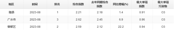 2023年8月,隨州市空氣監測數據:可吸入顆粒物(PM10)平均濃度值為33μg/m3,較去年同期升高3.1%;細顆粒物(PM2.5)平均濃度值為23μg/m3,較去年同期升高91.7%;二氧化硫(SO2)平均濃度值為6μg/m3,較去年同期升高20.0%;二氧化氮(NO2)平均度值為9μg/m3,較去年同期升高28.6%;一氧化碳(CO)第95百分位值為0.8mg/m3,較去年同期無變化;臭氧(O3)8小時最大值日第90百分位值為150μg/m3,較去年同期升高8.7%。