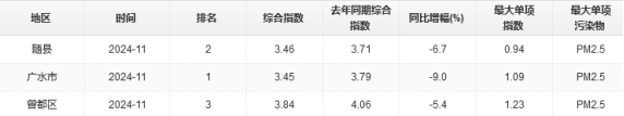 2024年11月,隨州市空氣監測數據:可吸入顆粒物(PM10)平均濃度值為58μg/m3,較去年同期降低12.1%;細顆粒物(PM2.5)平均濃度值為43μg/m3,較去年同期降低4.4%;二氧化硫(SO2)平均濃度值為8μg/m3,較去年同期降低11.1%;二氧化氮(NO2)平均濃度值為25μg/m3,較去年同期降低3.8%;一氧化碳(CO)第95百分位值為0.9mg/m3,較去年同期降低10.0%;臭氧(O3)8小時最大值日第90百分位值為129μg/m3,較去年同期升高4.0%。