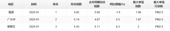 2025年1月,隨州市空氣監(jiān)測(cè)數(shù)據(jù):可吸入顆粒物(PM10)平均濃度值為97μg/m3,較去年同期升高9.8%;細(xì)顆粒物(PM2.5)平均濃度值為70μg/m3,較去年同期降低2.8%;二氧化硫(SO2)平均濃度值為11μg/m3,較去年同期升高37.5%;二氧化氮(NO2)平均濃度值為33μg/m3,較去年同期升高10.0%;一氧化碳(CO)第95百分位值為1.4mg/m3,較去年同期降低16.7%;臭氧(O3)8小時(shí)最大值日第90百分位值為111μg/m3,較去年同期升高19.4%。