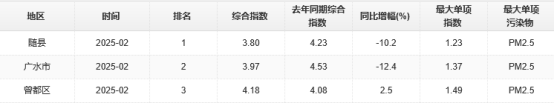 2025年1-2月,隨州市空氣監測數據:可吸入顆粒物(PM10)平均濃度值為85μg/m3,較去年同期升高4.9%;細顆粒物(PM2.5)平均濃度值為61μg/m3,較去年同期降低6.2%;二氧化硫(SO2)平均濃度值為10μg/m3,較去年同期升高25.0%;二氧化氮(NO2)平均濃度值為28μg/m3,較去年同期升高27.3%;一氧化碳(CO)第95百分位值為1.3mg/m3,較去年同期升高8.3%;臭氧(O3)8小時最大值日第90百分位值為111μg/m3,較去年同期升高6.7%。