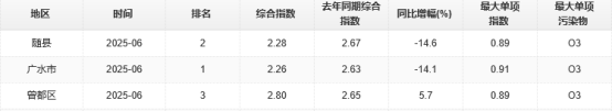 2025年6月,隨州市空氣監測數據:可吸入顆粒物(PM10)平均濃度值為36μg/m3,較去年同期升高12.5%;細顆粒物(PM2.5)平均濃度值為27μg/m3,較去年同期升高22.7%;二氧化硫(SO2)平均濃度值為6μg/m3,較去年同期下降14.3%;二氧化氮(NO2)平均濃度值為10μg/m3,較去年同期升高42.9%;一氧化碳(CO)第95百分位值為1.1mg/m3,較去年同期升高37.5%;臭氧(O3)8小時最大值日第90百分位值為143μg/m3,較去年同期降低15.4%。