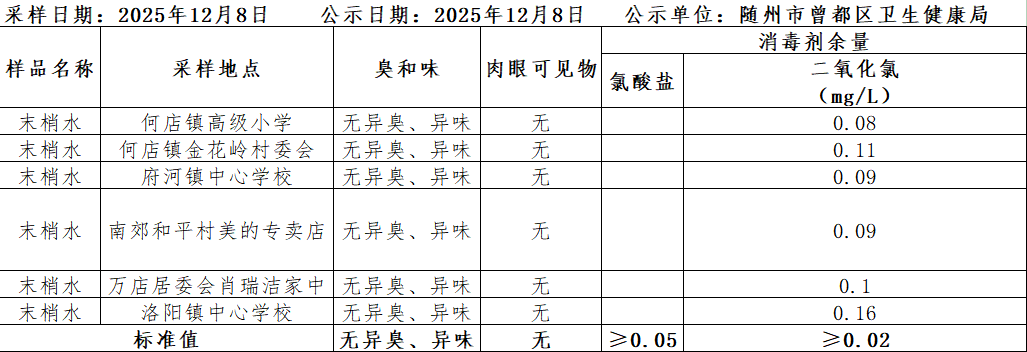 2025年12月8日曾都區鎮級生活飲用水衛生監測結果公示