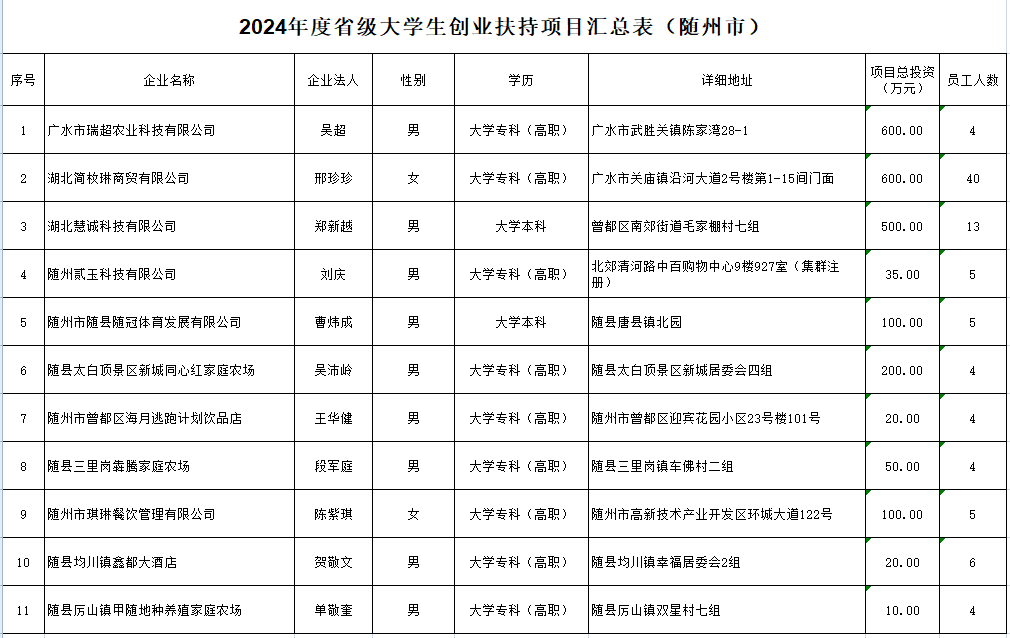 根據(jù)《關(guān)于開展2024年度大學(xué)生創(chuàng)業(yè)扶持項(xiàng)目申報(bào)工作的通知》(鄂人社函〔2024〕1號(hào))精神,參照項(xiàng)目初選評(píng)審標(biāo)準(zhǔn),綜合項(xiàng)目實(shí)地察看情況,從創(chuàng)新引領(lǐng)、帶動(dòng)就業(yè)、項(xiàng)目團(tuán)隊(duì)、發(fā)展現(xiàn)狀和前景等,經(jīng)綜合評(píng)審,確定了擬推薦申報(bào)2024年度省級(jí)大學(xué)生創(chuàng)業(yè)扶持項(xiàng)目(名單附后),現(xiàn)進(jìn)行5日公示,歡迎社會(huì)各界進(jìn)行監(jiān)督。如對(duì)所公示情況有異議,請(qǐng)向市勞動(dòng)就業(yè)服務(wù)中心反映。