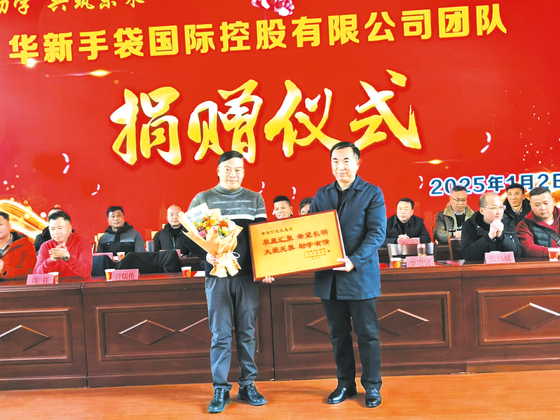 近日,華新手袋國際控股有限公司向廣水市蔡河鎮(zhèn)中心中學(xué)捐贈了價值15萬元的電腦、毛衣等愛心物資。圖為捐贈儀式現(xiàn)場。