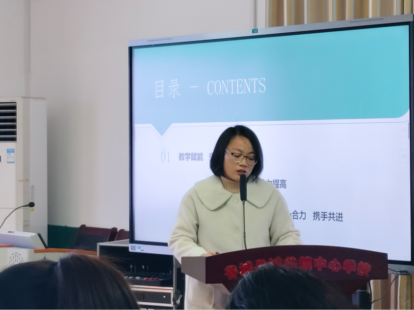 石花二中英語教研組長劉蓉老師從新課標引領專業成長、做實常規夯實教學根基、重視聽說教學、團隊協同合作四個方面深入闡述了該校英語教學工作的開展情況,從而把學校的教學質量推向新的高度。