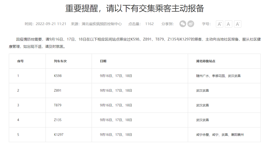 9月22日,“湖北疾控”公眾號發布《湖北疾控專家提醒:乘坐火車時要做好個人防護》,全文如下: